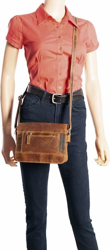 β’ Een stevige verstelbare schouderband van leer en katoen.