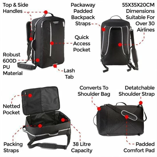 De afmetingen van de CabinMax Bergen Rugzak is 55x40x20 cm waarmee hij binnen de handbagage afmetingen van 94% van de luchtvaartmaatschappijen past, waaronder EasyJet, Ryanair, Thomas Cook, German Wings, Noors, Virgin, BA, Lufthansa, Jet2, Lingus, Flybe, Delta, American, Emirates en nog veel meer. Met een enorme capaciteit van 38 liter heb je genoeg ruimte voor uw items. Verder is de tas gemaakt van het sterke 600D polyester, wat hem ontzettend duurzaam maakt. De rugzak is zeer stabiel en waterafstotend. Ideaal voor vliegreizen, weekends en korte spontane reizen, maar ook voor lange reizen. Vlieg comfortabel zonder je bagage in te checken!