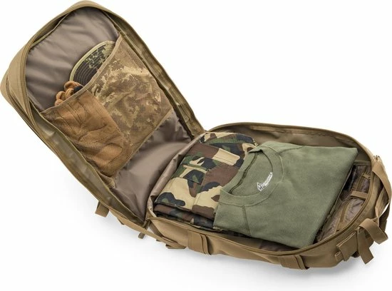 De indeling is zeer praktisch. Het hoofdcompartiment bevat zowel een rits- als een meshvak. Het middencompartiment heeft een insteekvakje met daarop 2 meshvakjes aan de binnenkant. Daarnaast heeft deze tactical backpack 2 voorvakken; een groot voorvak met een insteekvak en een klein voorvak bovenin. Alle hoofdvakken zijn voorzien van een waterdichte YKK-rits.
