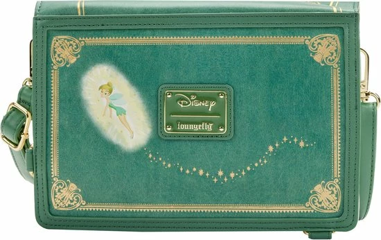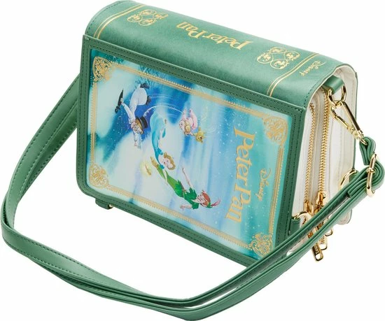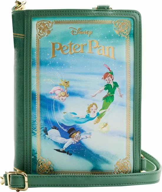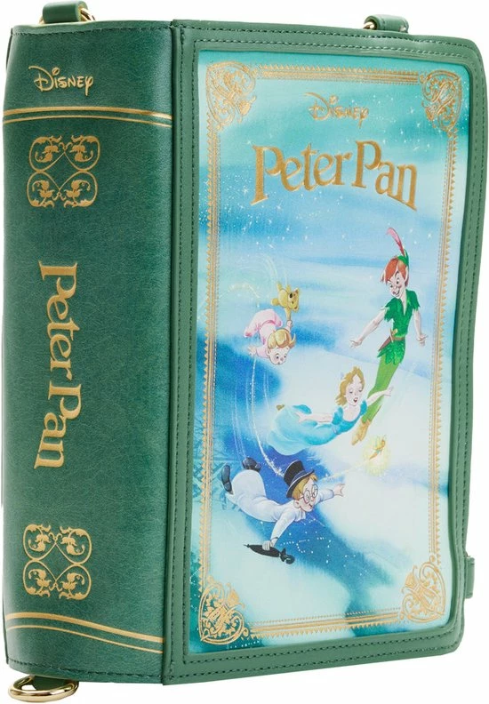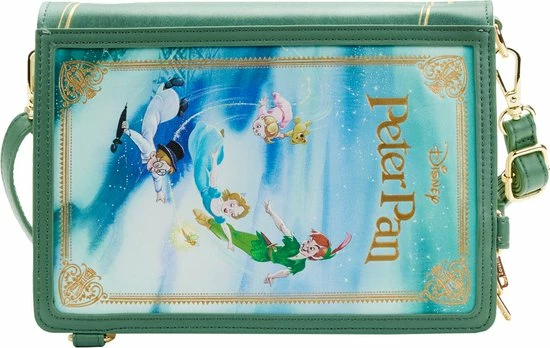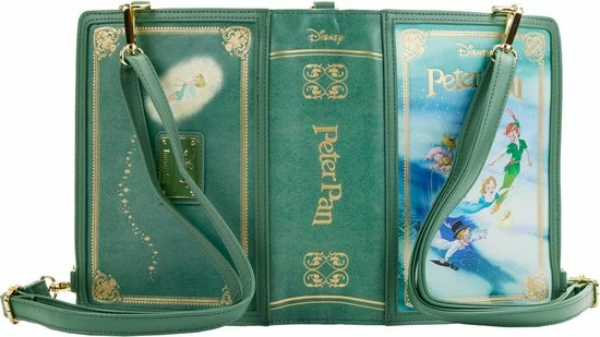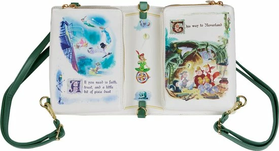 Crossbody-tas Peter Pan Convertible. Prachtige kunstlederen tas uit de Disney-collectie van het Amerikaanse designermerk Loungefly. Deze tas is zowel als rugtas en crossbody-tas te gebruiken. Als rugzak hangt de tas als een opengeklapt sprookjesboek op je rug. Als schoudertas is het boek gesloten. Zowel het dicht- als opgeklapte boek is uitgevoerd als het sprookjesboek over Peter Pan, de jongen die niet volwassen wilde worden. De tas is voorzien twee verstelbare schouderbanden en een bijpassende binnenvoering. Voor de schoudertas gebruik je maar 1 van de bijgevoegde schouderbanden.