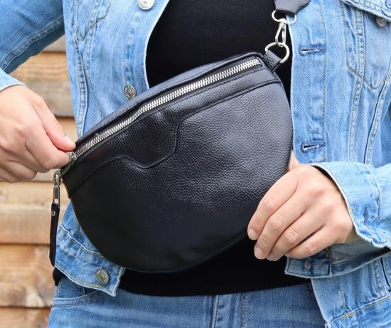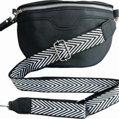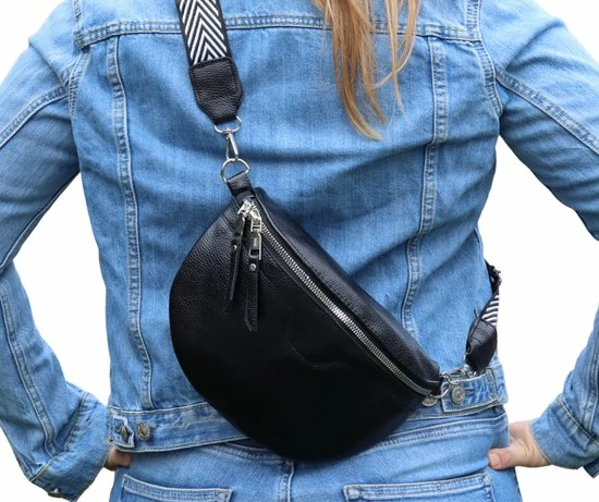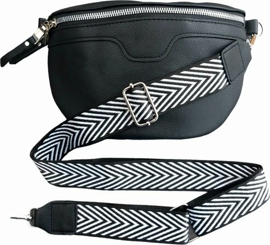 Trendy crossbody tas (bumbag) met zilverkleurige rits/details en stoffen schouderband.