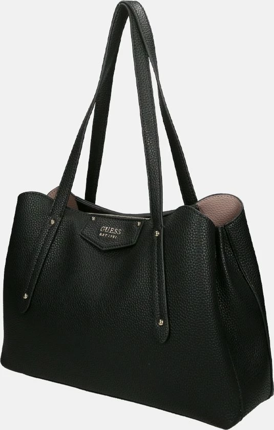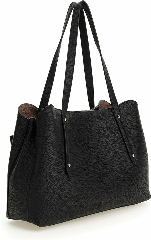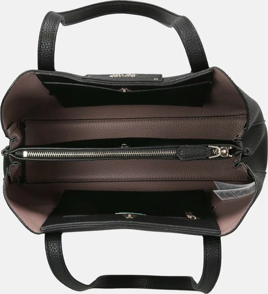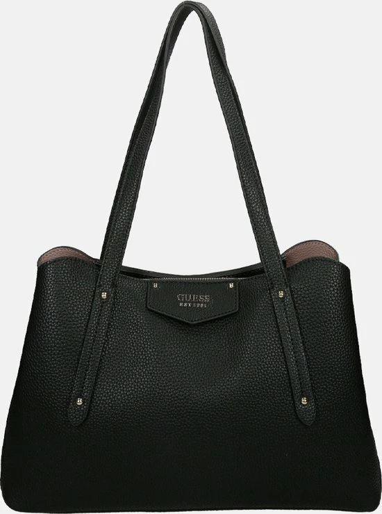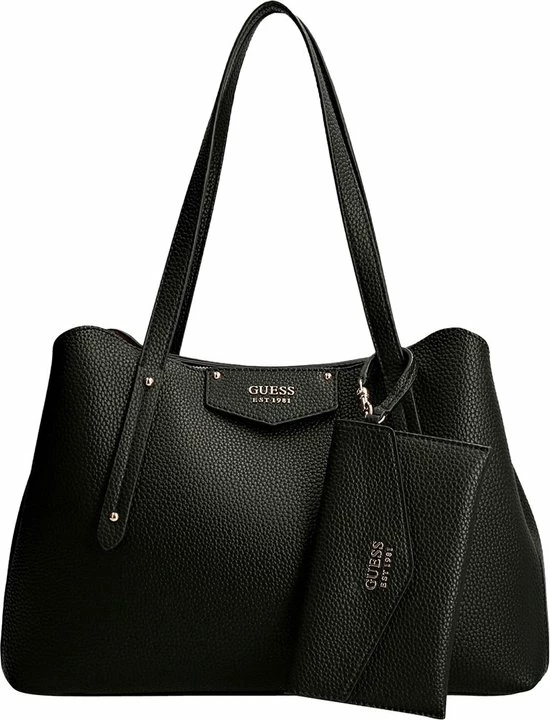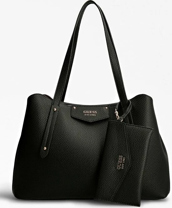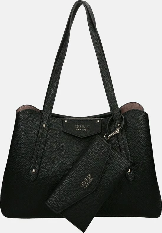Super mooie zwarte dames handtas afgewerkt met gouden details uit de nieuwe collectie van Guess. OP de voorkant zit een kleine zwarte portemonnee, super leuke combinatie!