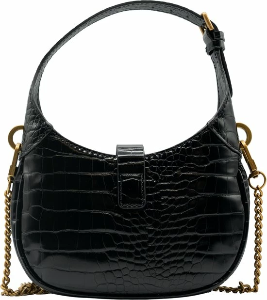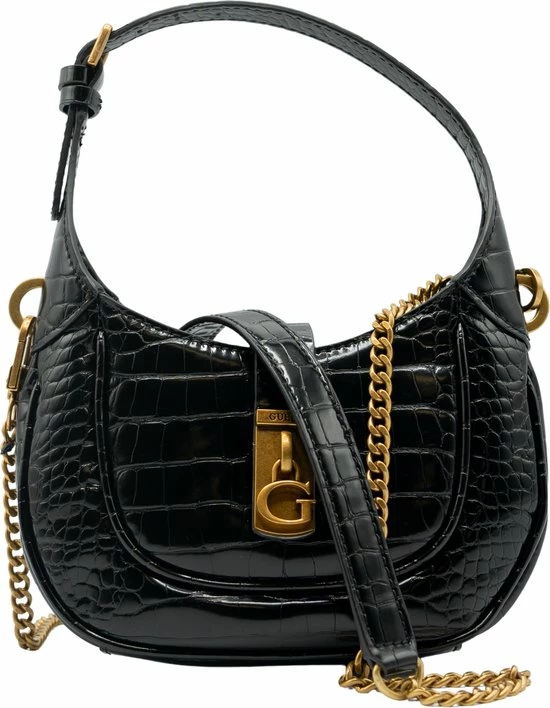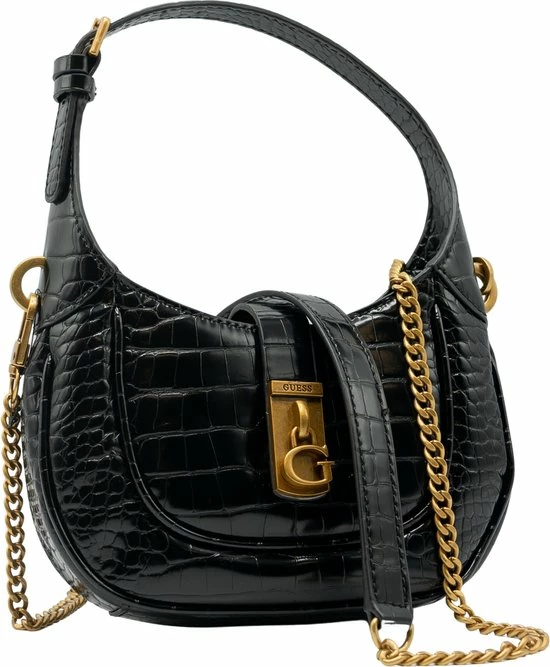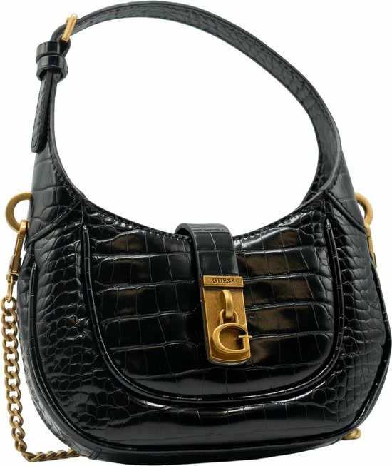 Mooi klein handtasje in de kleur zwart uit de nieuwste zomer collectie van Guess. Het tasje is voorzien van een lak croco print afgewerkt met een goudkleurig merklogo aan de voorzijde wat zorgt voor een luxe uitstraling. De tas beschikt over twee hengsels waarvan de een afneembaar is. De tas is mooi te combineren voor een avond uit.