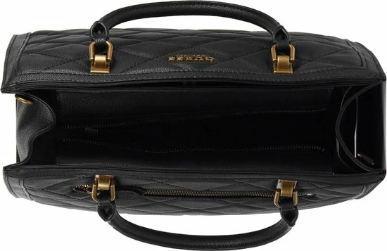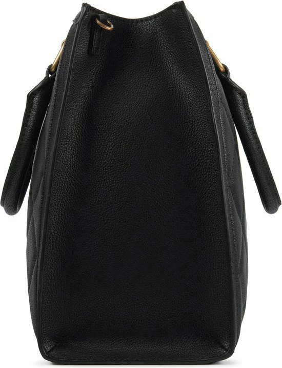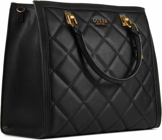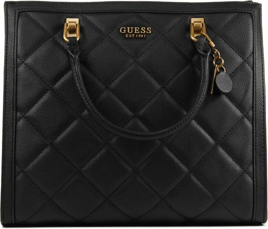 Damestas model Abbey in de kleur zwart van Guess Pasvorm De afmetingen van deze tas bedragen 35 cm x 15 cm x 29 cm (LxBxH) Beschrijving Doorgestikte schoudertas voor dames van het merk Guess. Deze shopper is uitgevoerd in zwart leer en afgewerkt met goudkleurige details. De tas is af te sluiten met een rits. De binnenzijde is uitgevoerd in stof en bevat meerdere vakken voor het opbergen van items. Deze tas heeft naast de vaste korte hengsels ook een langer leren hengsel om de tas over de schouder te dragen.
