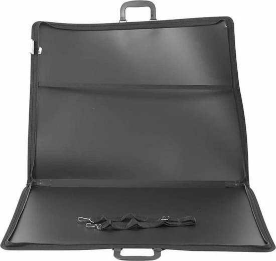 Portfolio tekeningen opbergmap A2. Zwarte, waterdichte portfolio map met ritssluiting en handvat. Aan de buitenzijde zit een oog waaraan u de meegeleverde verstelbare schouderband vast kunt maken. Hierdoor is de opbergmap nog gemakkelijker mee te nemen. Materiaal: polypropyleen. Afmeten: ca. 74 x 55 cm. Geschikt voor A2 formaat tekeningen/documenten. Portfolio en teken accessoires.