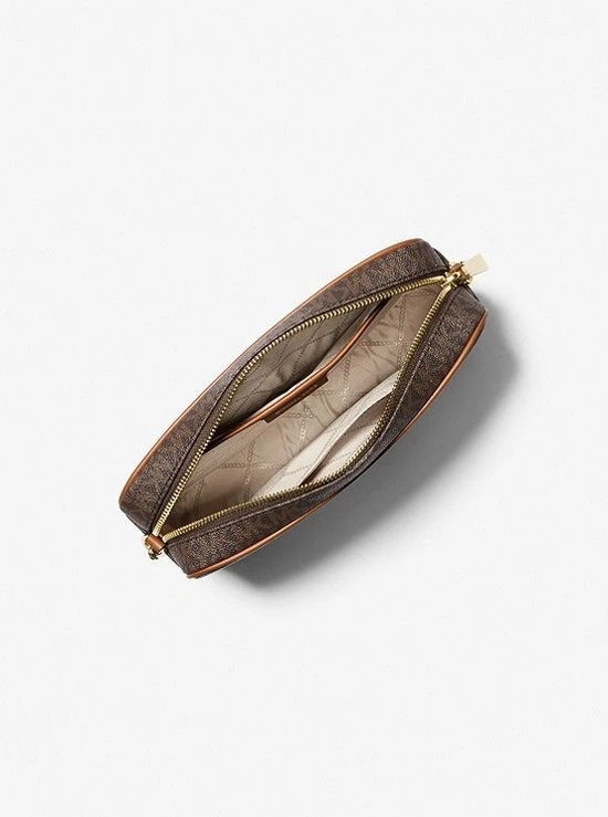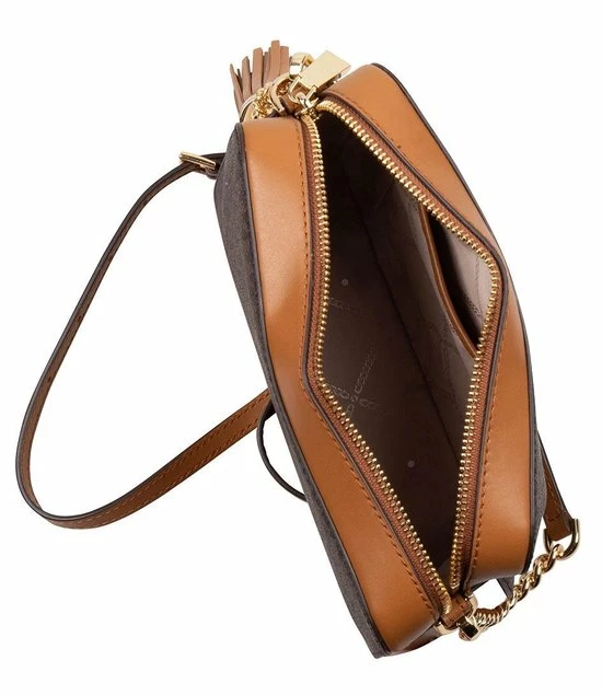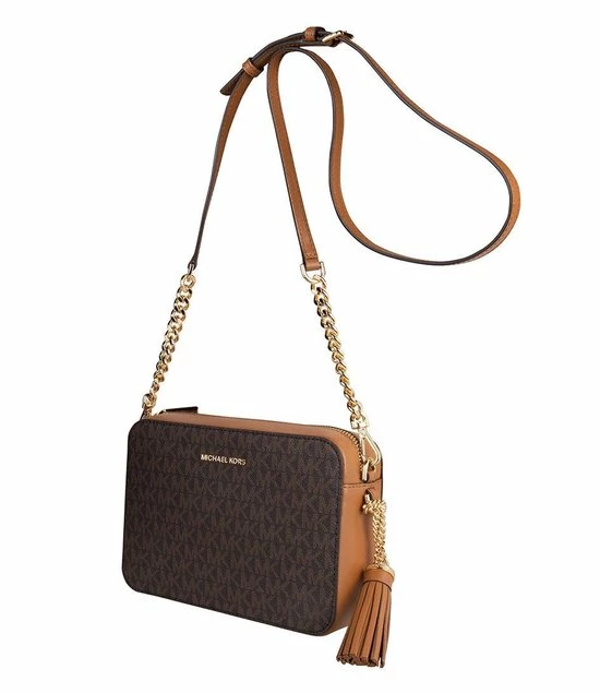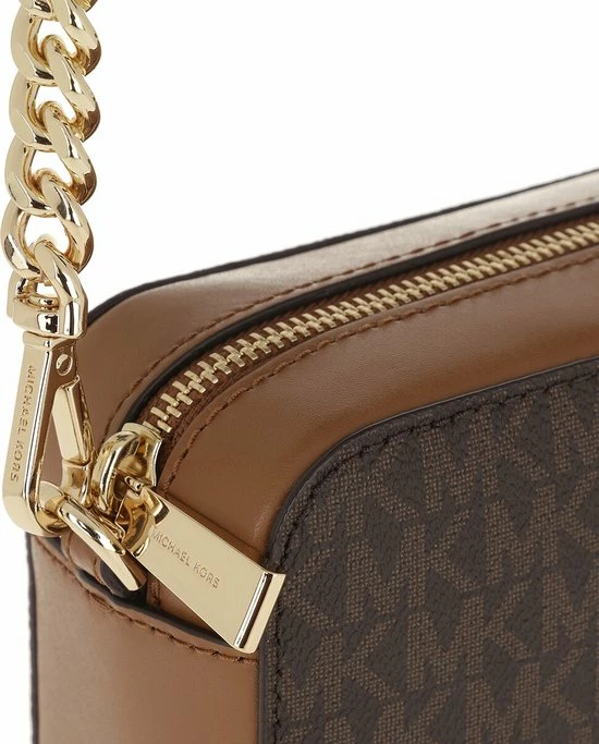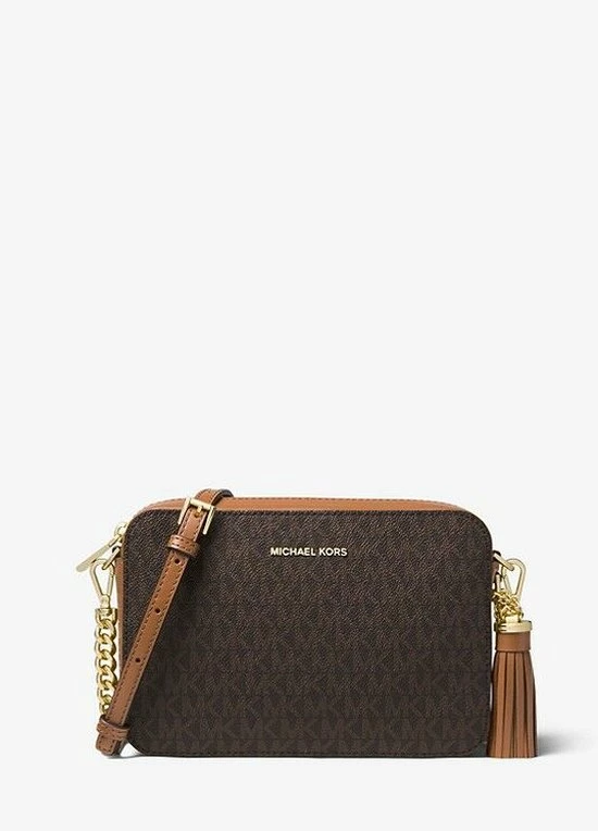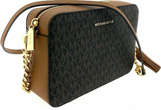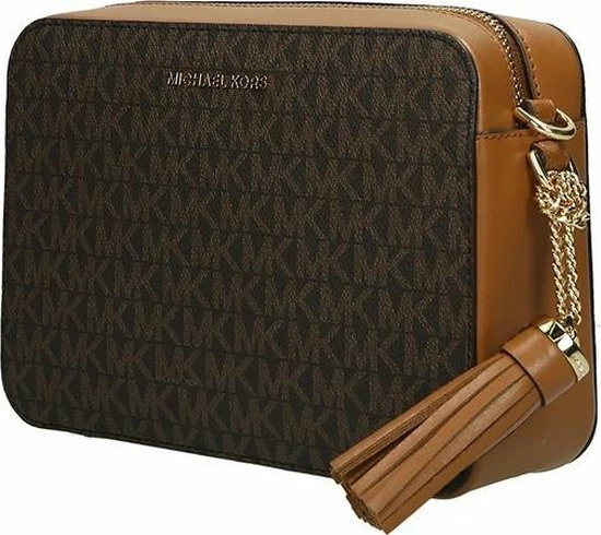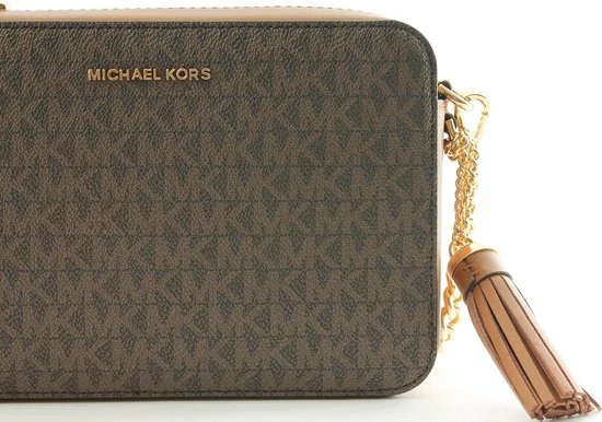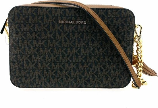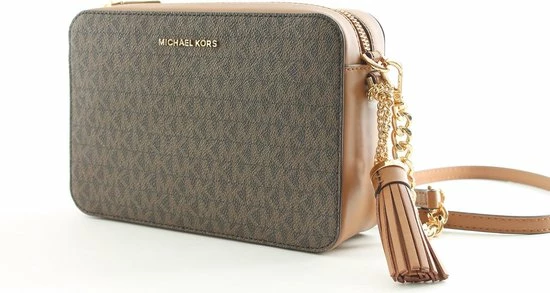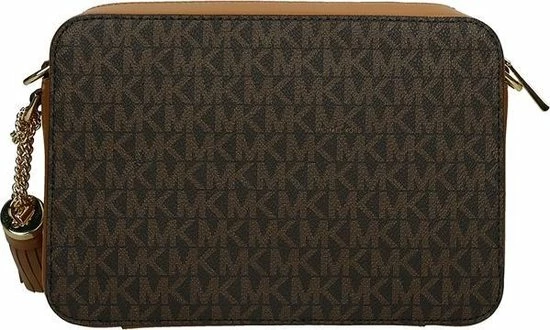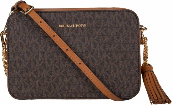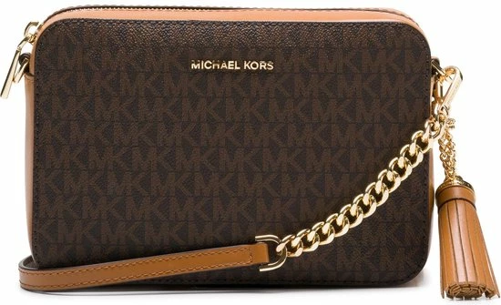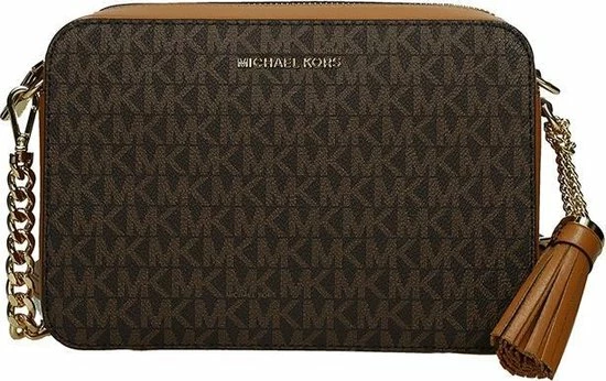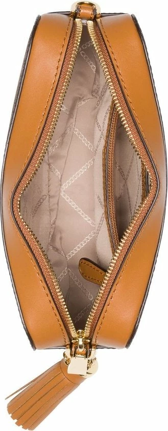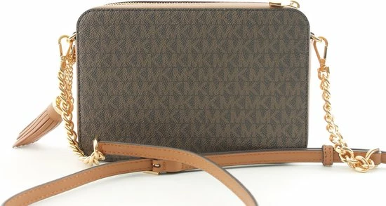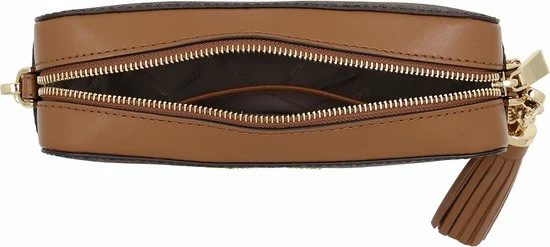 Michael Kors iconic crossbody tas met all over print. Tas heeft goudkleurige accenten en is bekleed met canvas en heeft goudkleurige details. Discreet MK logo aan voorzijde van tas. Tas is voorzien van afneembare leren tassel