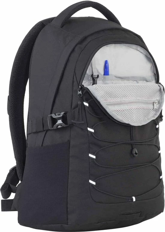 Het ruime hoofdvak is eenvoudig te openen middels de afsluitbare ritsen. Aan de binnenkant bevindt zich een 13.3โ vak voor je laptop en een handige sleutelhanger zodat je nooit meer op zoek hoeft naar je sleutelbos. De gevoerde handgreep zorgt voor optimaal draagcomfort mocht je de tas niet op je rug willen dragen en de gevoerde onderkant biedt extra bescherming wanneer de rugzak op de grond staat. Daarnaast wordt hij geleverd met een geรฏntegreerde regenhoes en is de hele tas voorzien van reflectiedetails waardoor je hem zonder problemen in het donker mee kunt nemen. De stabilisatiebanden bieden extra versteviging tijdens het dragen, maar kun je verbergen indien je ze niet gebruikt.