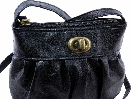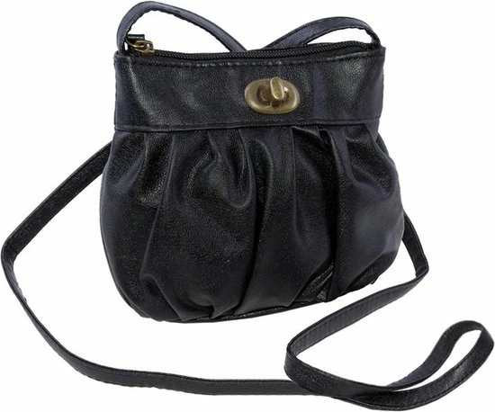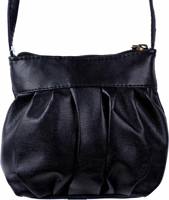Zwart, klein tasje van ecologisch leer met een lange schouderband.