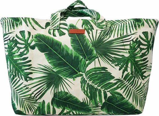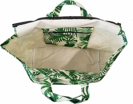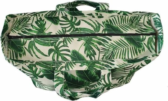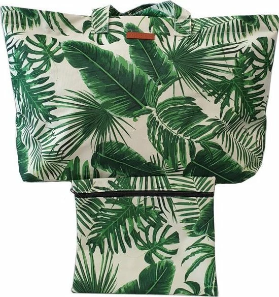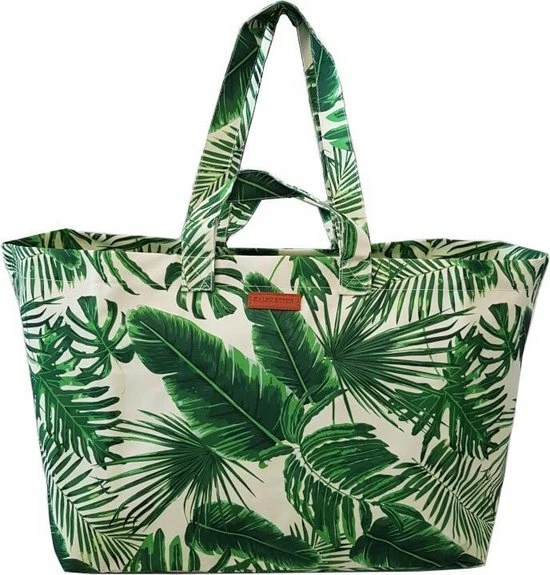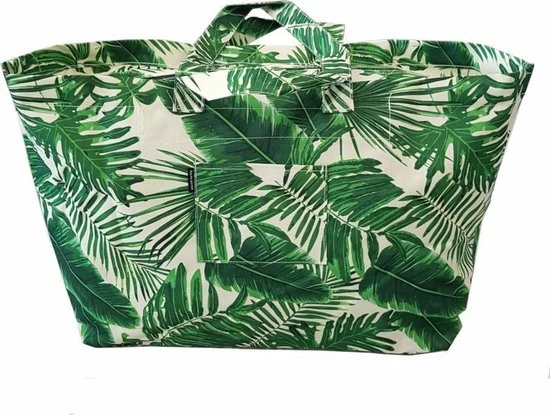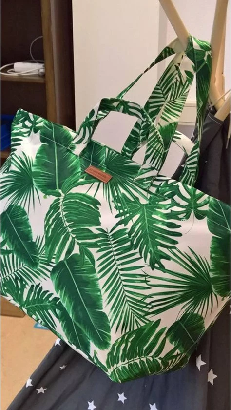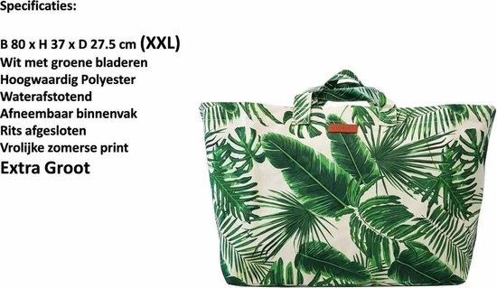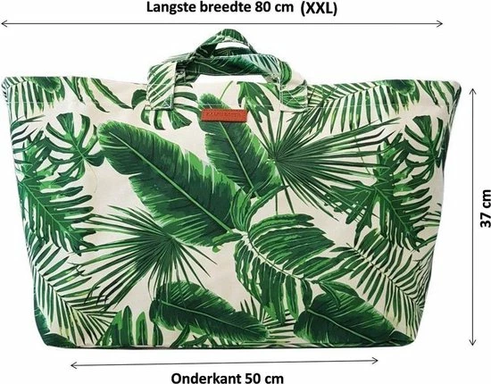 Grote tas/shopper/boodschappentas XXL met print in de kleur groen. Tas kan gebruikt worden voor een weekend weg, sporttas, strandtas,boodschappentas en dergelijke. De tas heeft een afmeting van B 80 x H 37 x D 27.5 cm (EXTRA GROOT). Onderkant is 50 cm breed en die bovenkant van de tas is 80 cm breed. Binnenin de tas is er een kleine tasje met rits, die afneembaar is d.m.v. drukknopen. Aan de achterzijde bevindt zich ook een klein vakje en de tas wordt afgesloten d.m.v. een rits. De tas heeft korte handvatten en wat langere handvatten, waardoor de tas eenvoudig over de schouder gedragen kan worden.