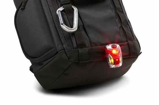 - Geรฏntegreerd bevestigingssysteem met lussen voor karabijnhaken of fietslampje