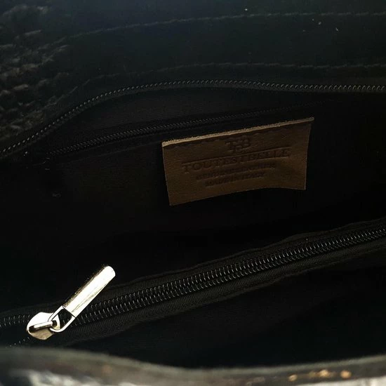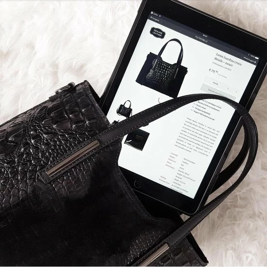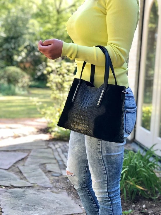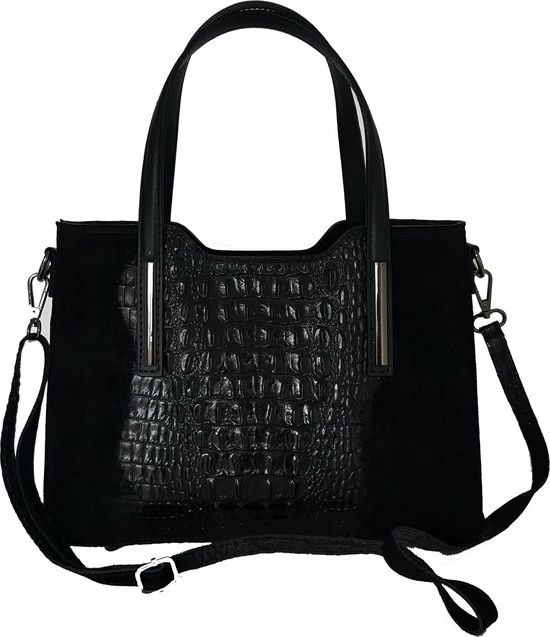Unieke stijlvolle dames handtas in zwart leer met suede. Het leer is prachtig bewerkt zodat het croco relief mooi overloopt in het matte en zachtere suede. Leuk detail: de tas heeft twee verschillende zijden (zie foto’s). Deze stevige tas heeft een afneembare schouderriem die in lengte is te verstellen. Ook heeft hij studs aan de onderkant voor nog wat extra bescherming van de tas. De binnenkant is afgewerkt met vier verschillende vakken waarvan een met extra ritssluiting. De tas zelf sluit u ook met rits. “Made in Italy”, dus van top-kwaliteit.