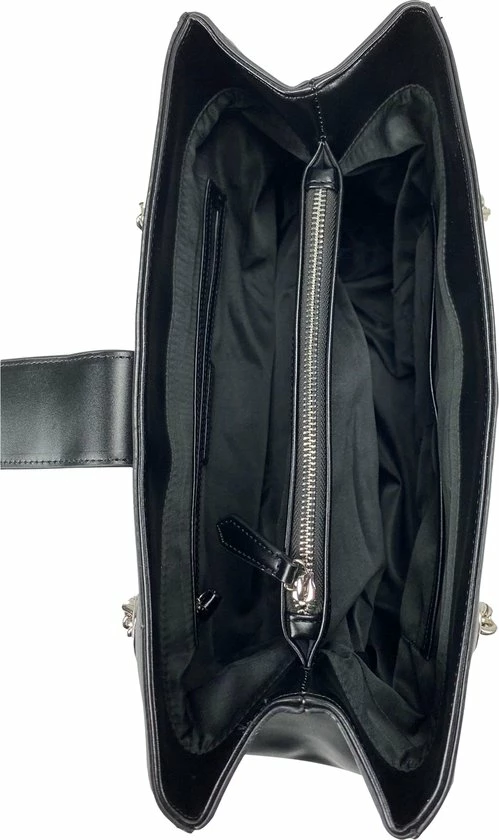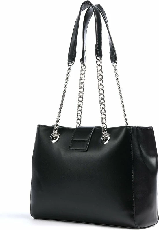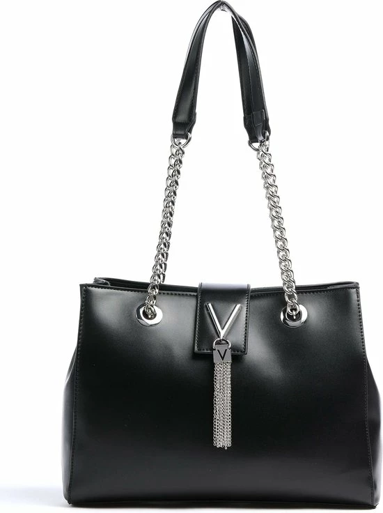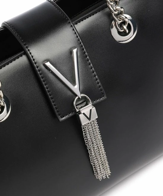 Stijlvolle shopper met mooi zilverkleurige details : Valentino -V en franjes + handvaten met zilverkleurige schakelketting.