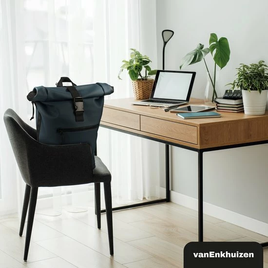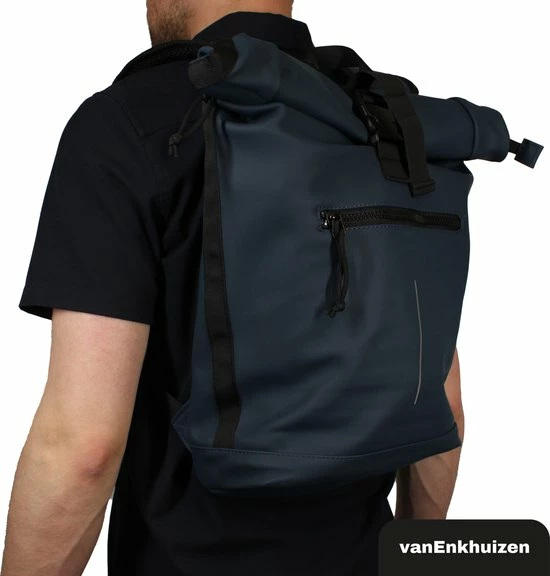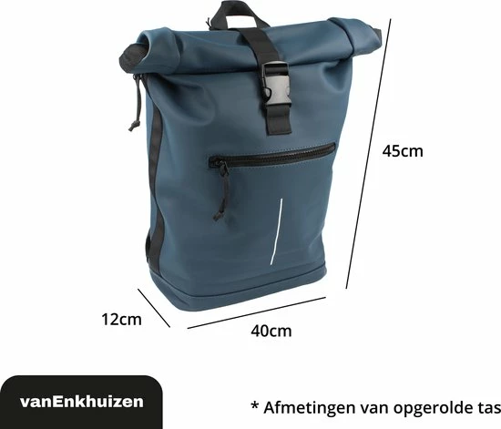 Neem je spullen overal mee naartoe in deze stijlvolle van Enkhuizen Rolltop Rugzak voor dames en heren. Maak de rugtas groter en kleiner door de sluiting op of uit te rollen. Het laptopvak biedt ruimte aan een 15,6 inch laptop, die droog blijft via het waterafstotende Tarpaulin. Houd je spullen warm of koud dankzij de thermo binnenzijde en gebruik de ritsvakken om kleine spullen weg te stoppen. Veilig de weg op in het donker is geen probleem door de reflectie strip op de rugzak. De gewatteerde schouderbanden zorgen voor ideaal draagcomfort, waardoor deze handige tas onmisbaar wordt.
