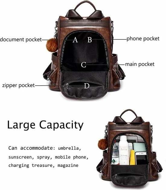 CAPACITEIT: β rugzak met grote capaciteit β‘ een verborgen muurvak β’ twee zijvakken. Er is plaats voor genoeg producten zoals Ipad, paraplu, portemonnee, waterfles, boeken, enzovoort.
