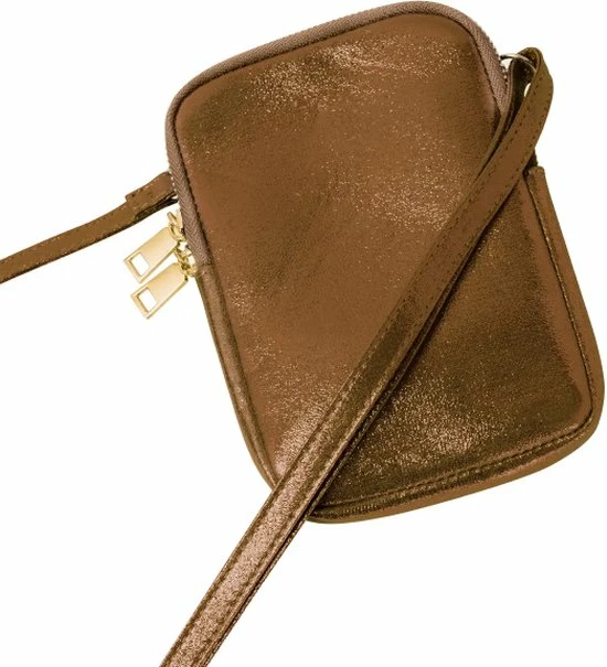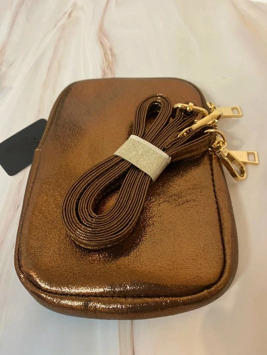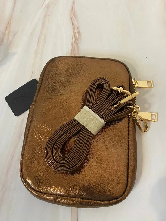 De crossbody tas is in een glanzende gouden metallic kleur.